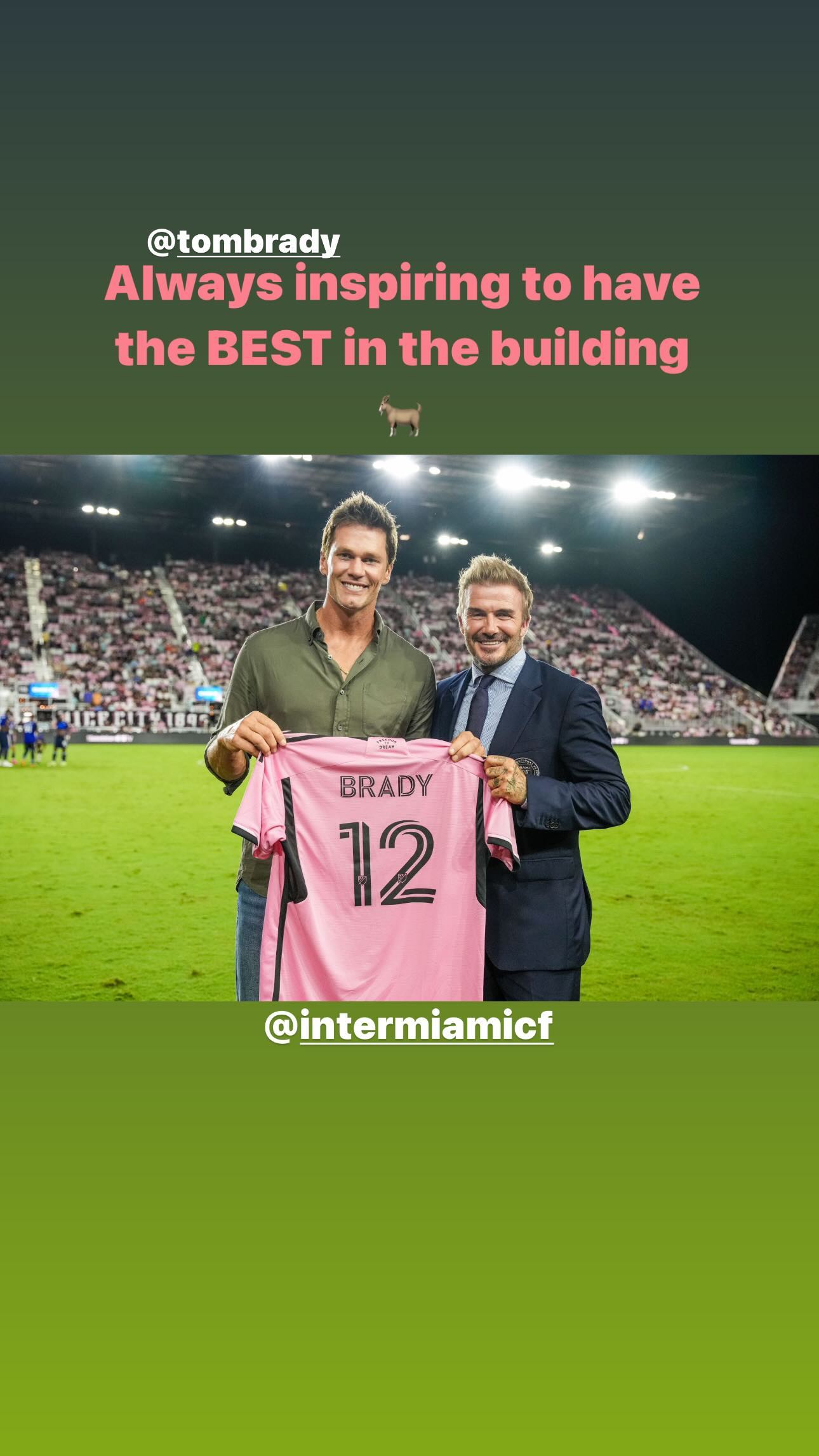 وأهدي ديفيد بيكهام قميصًا لتوم برادي إنستجرام ديفيد بيكهام ، خلال المباراة، وأشاد ديفيد بيكهام برادي في ملعب تشيس، وأعطاه قميص إنتر ميامي الذي يحمل اسمه والرقم 12 عليه، وهو نفس الرقم الذي ارتداه خلال مسيرته المميزة مع فريق نيو إنجلاند باتريوتس.